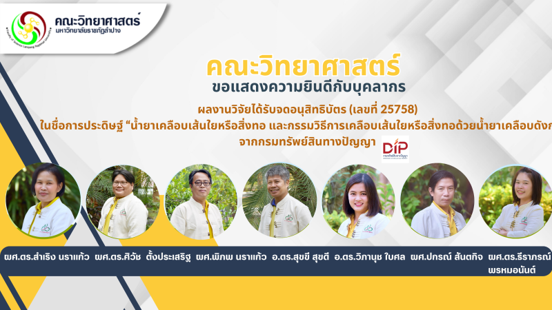 คณะวิทยาศาสตร์ขอแสดงความยินดีกับคณาจารย์ที่ผลงานวิจัยได้รับจดอนุสิทธิบัตร (เลขที่ 25758) ในชื่อการประดิษฐ์ “น้ำยาเคลือบเส้นใยหรือสิ่งทอ และกรรมวิธีการเคลือบเส้นใยหรือสิ่งทอด้วยน้ำยาเคลือบดังกล่าว” จากกรมทรัพย์สินทางปัญญา โดยประกาศโฆษณาในวันที่ 29 พฤษภาคม 2568