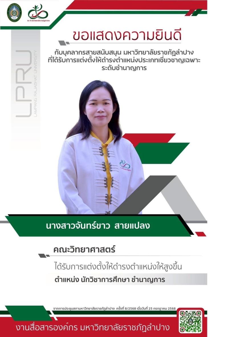 คณะวิทยาศาสตร์ ขอแสดงความยินดีกับบุคคลากรสายสนับสนุน ที่ได้รับการแต่งตั้งดำรงตำแหน่งที่สูงขึ้น นางสาวจันทร์ขาว สายแปลง ตำแหน่ง นักวิชาการศึกษา ชำนาญการ #จากการประชุมสภามหาวิทยาลัยราชภัฏลำปาง ครั้งที่ ๘/๒๕๖๘ เมื่อวันที่ ๒๕ กรกฎาคม ๒๕๖๘