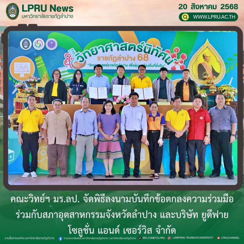 คณะวิทย์ฯ มร.ลป. จัดพิธีลงนามบันทึกข้อตกลงความร่วมมือร่วมกับสภาอุตสาหกรรมจังหวัดลำปาง และบริษัท ยูดีฟาย โซลูชั่น แอนด์ เซอร์วิส จำกัด เมื่อวันที่ 19 สิงหาคม 2568
