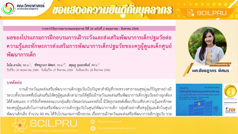 คณะวิทยาศาสตร์ขอแสดงความยินดีกับคณาจารย์ที่ผลงานวิจัยได้รับการตีพิมพ์เผยแพร่ในวารสารฐานข้อมูล TCI 1 ชื่อเรื่อง ผลของโปรแกรมการฝึกอบรมการเฝ้าระวังและส่งเสริมพัฒนาการเด็กปฐมวัยต่อความรู้และทักษะการส่งเสริมการพัฒนาการเด็กปฐมวัยของครูผู้ดูแลเด็กศูนย์พัฒนาการเด็ก, วารสารวิจัยการพยาบาลและสุขภาพ, 26(2), 1-15, e277875ม 2568.